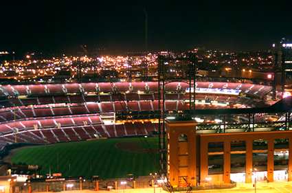 Busch Stadium: Night view from the Hilton Ballpark Hotel to the north