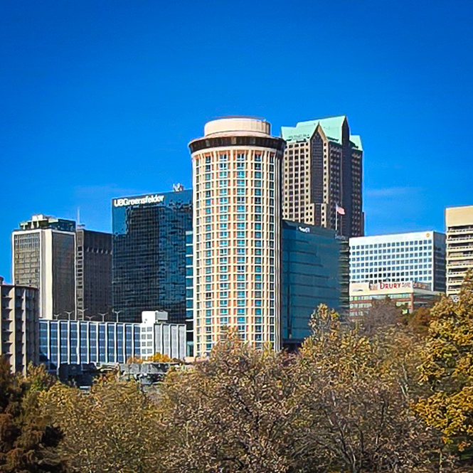 Millennium Hotel Saint Louis Tower I: Distant view from the southeast, Saturday, November 16, 2025