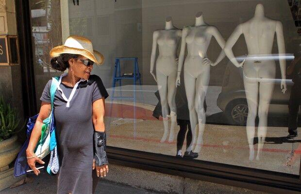 Railway Exchange Building: Renata Heard, 51, from St. Louis, standing outside after hearing that Macy's was going to close; May 20, 2013