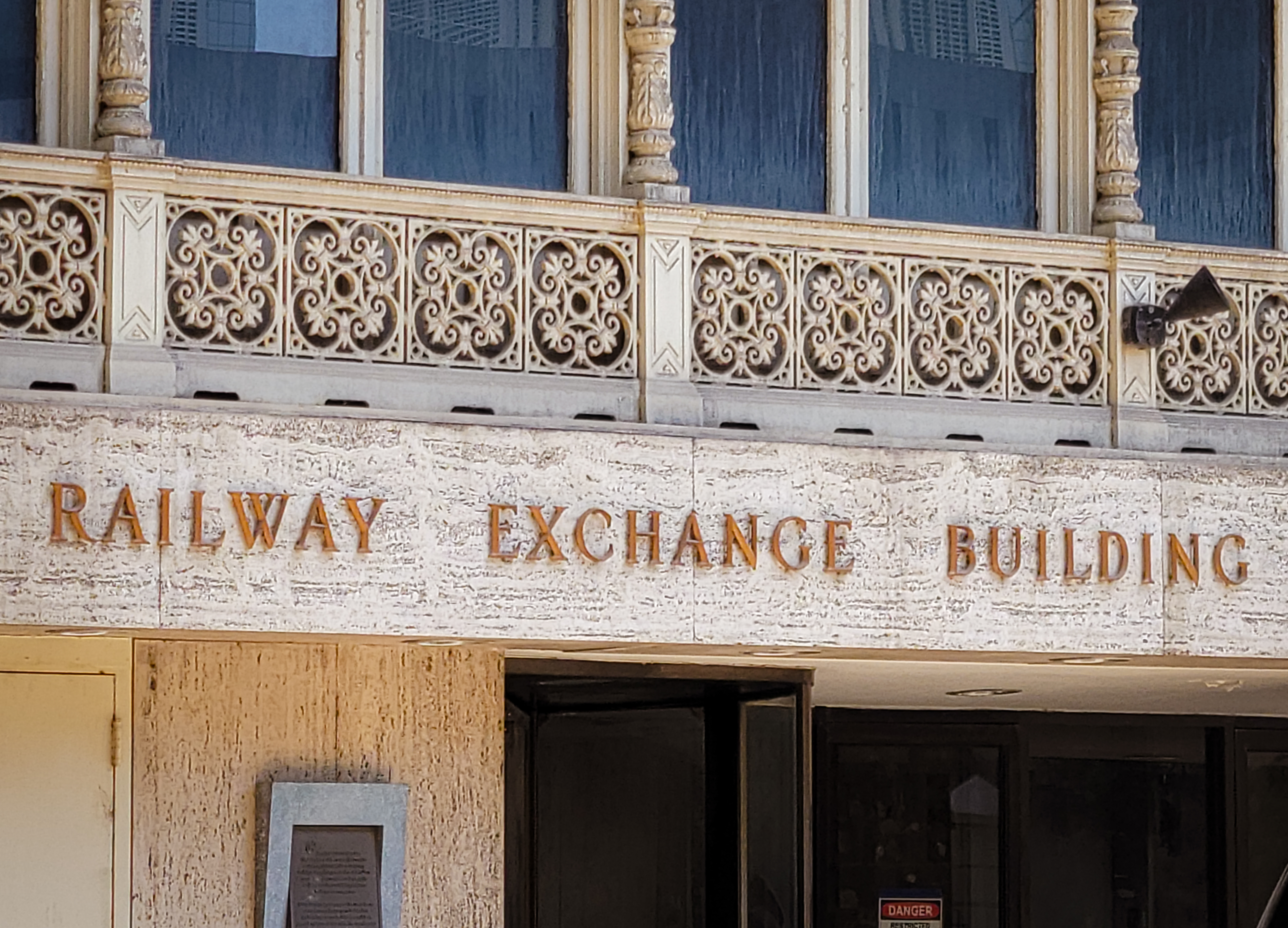 Railway Exchange Building: Detail of signage; June 19, 2021