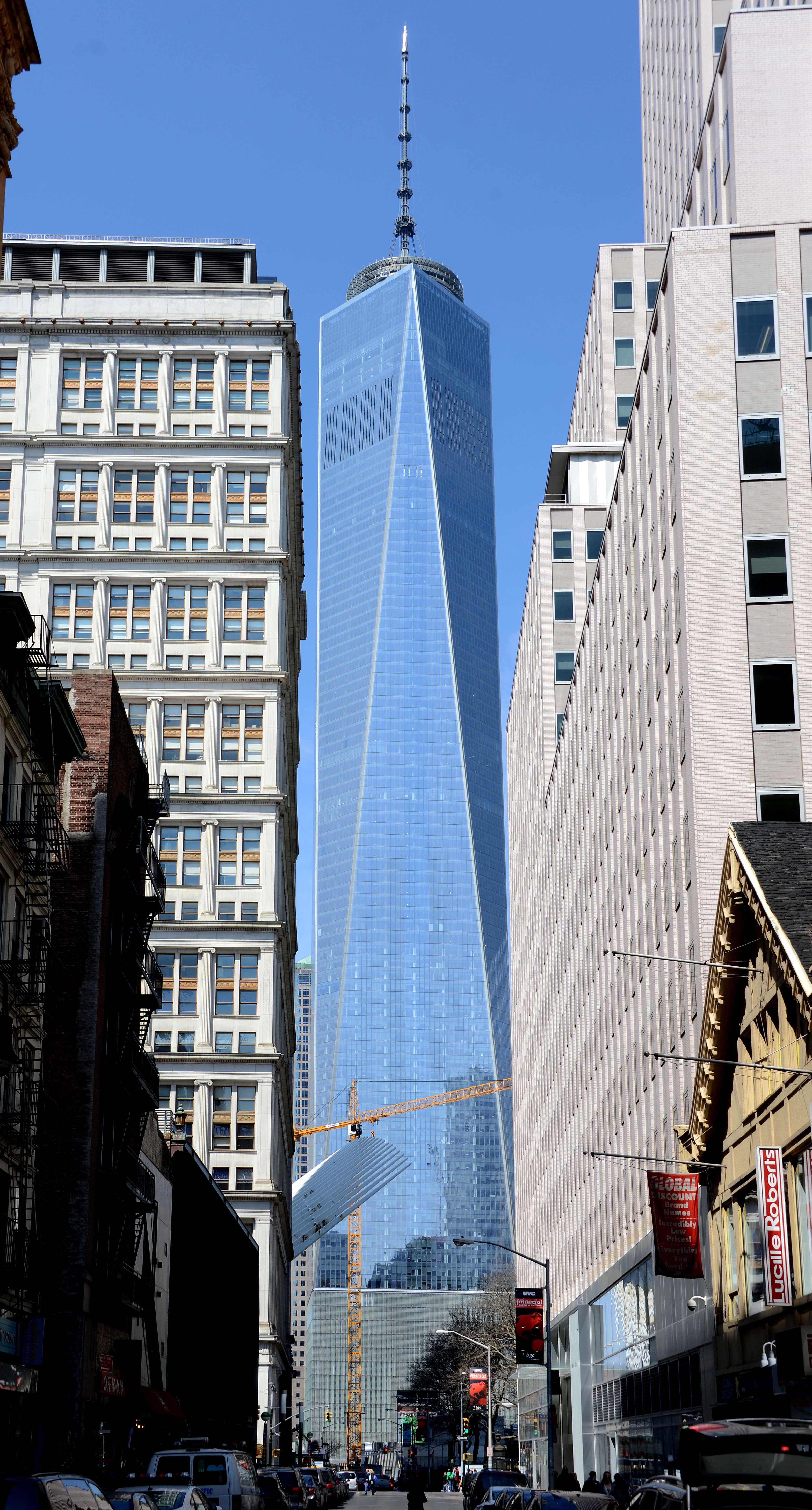 One World Trade Center: View from the southeast on Fulton Street
