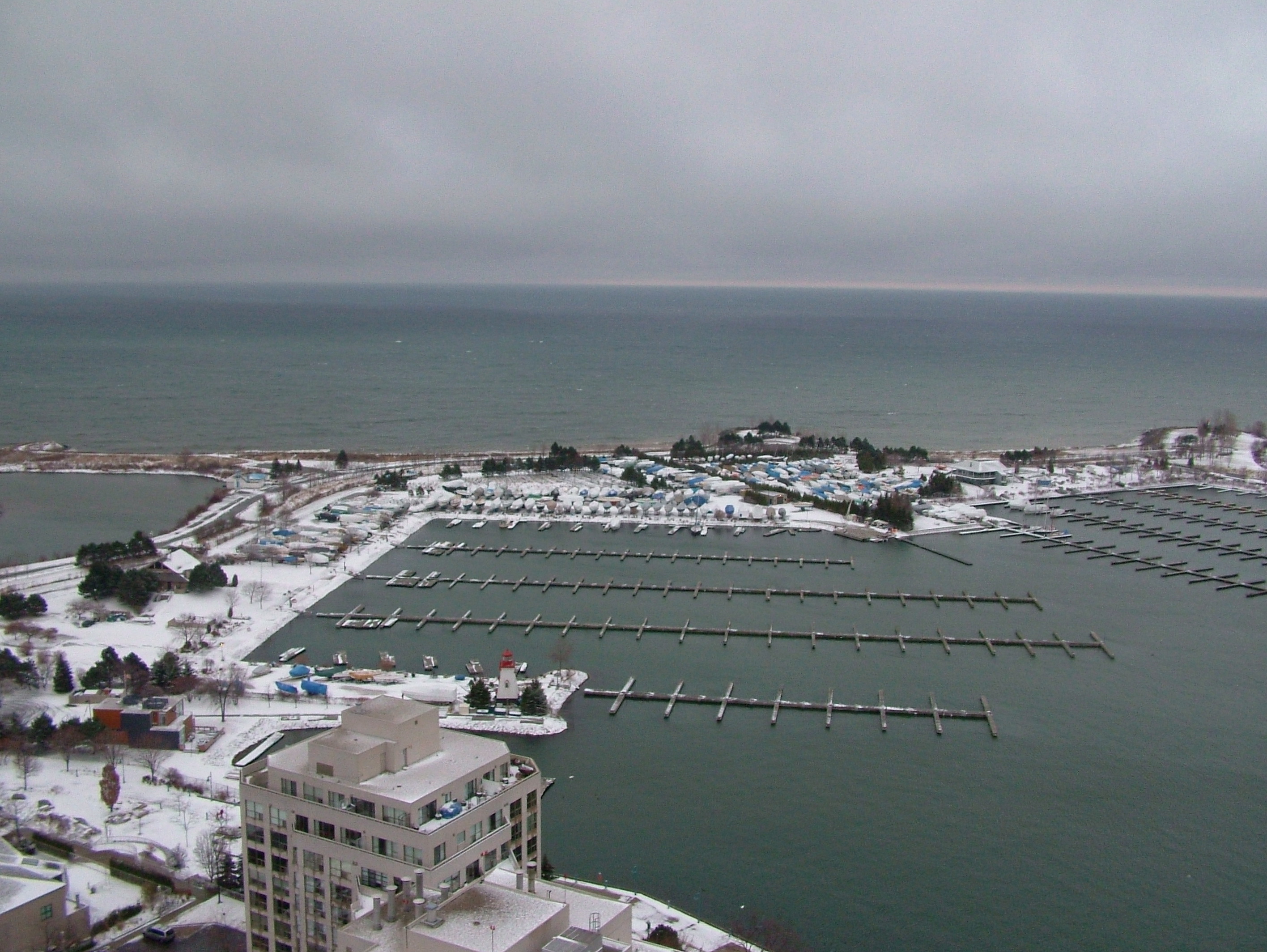 Marina del Rey 3: Looking down from the sky lounge onto building 3 of the complex and Humber Bay marina