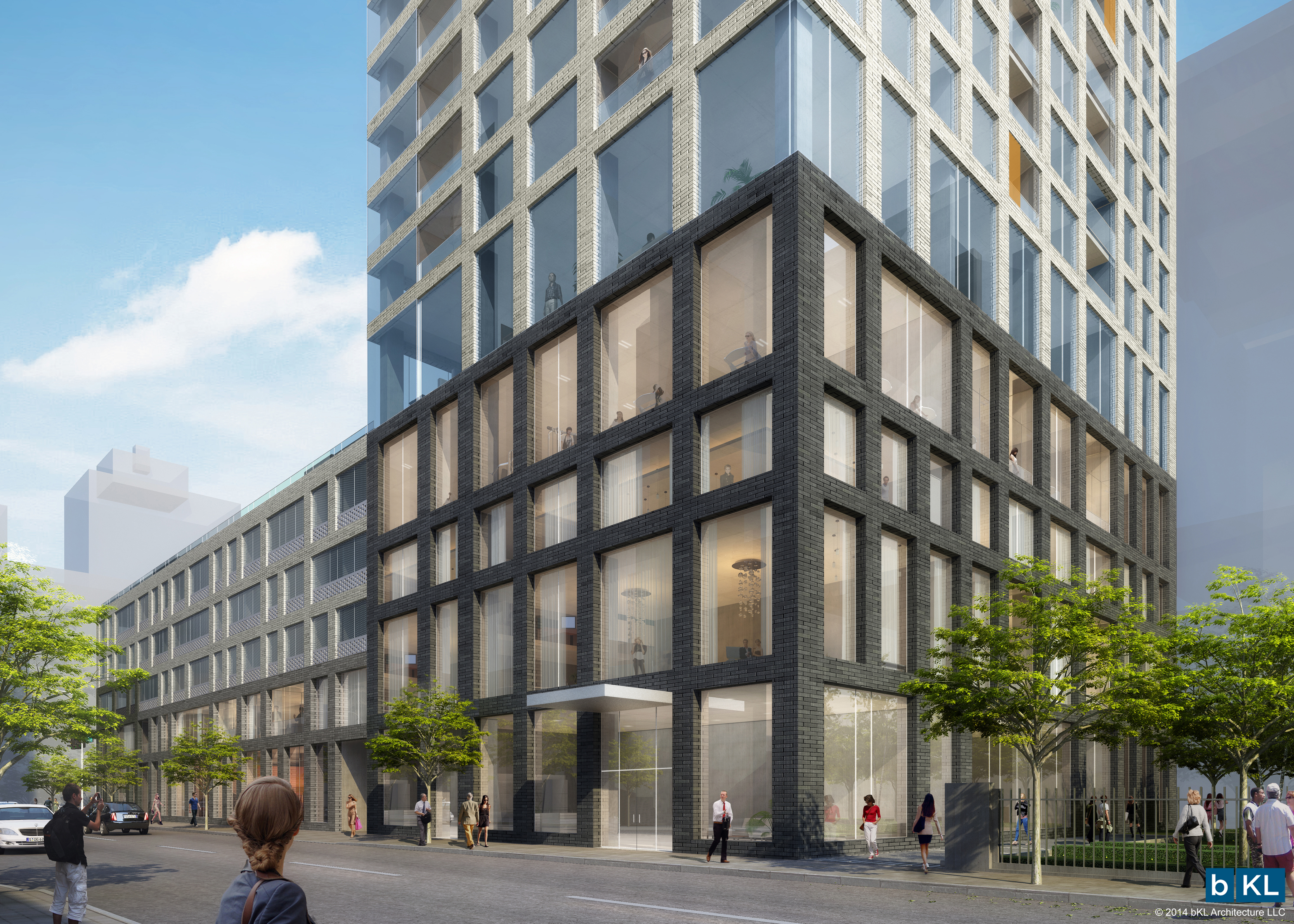 Exhibit on Superior: Rendering, base of the tower viewed from the northwest.