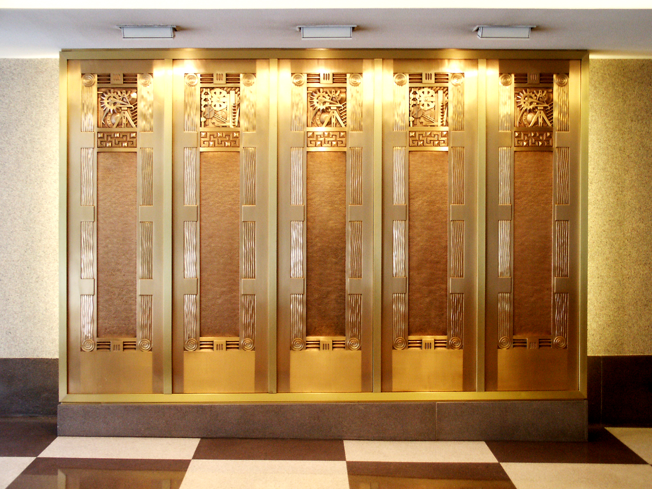 Engineering Building: Row of old elevator doors on display in the lobby